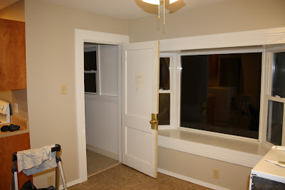 Here it is, the "kitchen" part of the space. (The washing machine is not usually in the kitchen.) My In-laws are having the interior re-painted before we move in and so things are kind of all over the place.